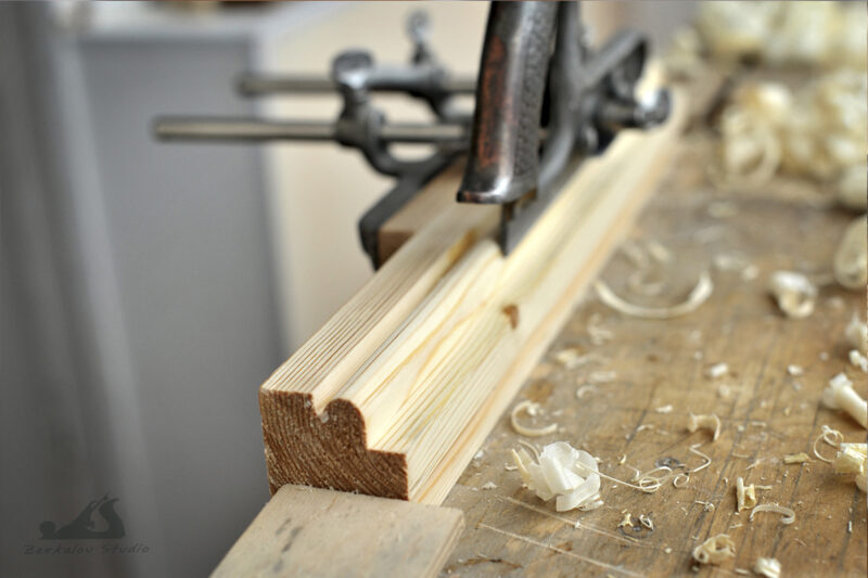 В дополнение к предыдущему посту добавляю несколько фото на тему работы шпунтубеля. На заточку ножей ушло не мало времени, поскольку отмачивал их сначала в преобразователе ржавчины на основе фосфорной кислоты. Потом выводил плоскость на камнях. Заводской угол заточки был 35° и я его не менял. Фаску на калевочных ножах затачивал не на всех. Использовал наждачную бумагу и заготовку с профилем для самого ножа. Такой способ мне не понравился и хочу попробовать точить фигурными водниками. На YouTube есть несколько роликов, в которых показана работа шпунтубеля от Record. Вот ссылка и вот ссылка. Тут выбрал четверть и прошелся калевочным вогнутым. Получился такой вот валик.
