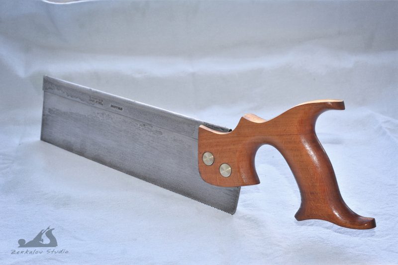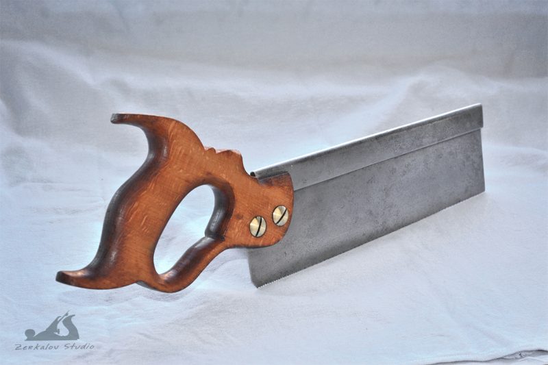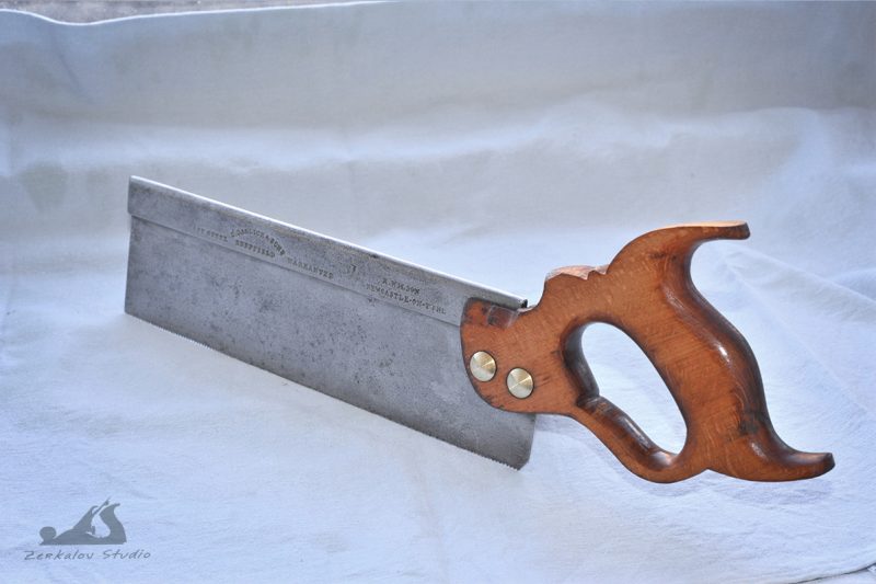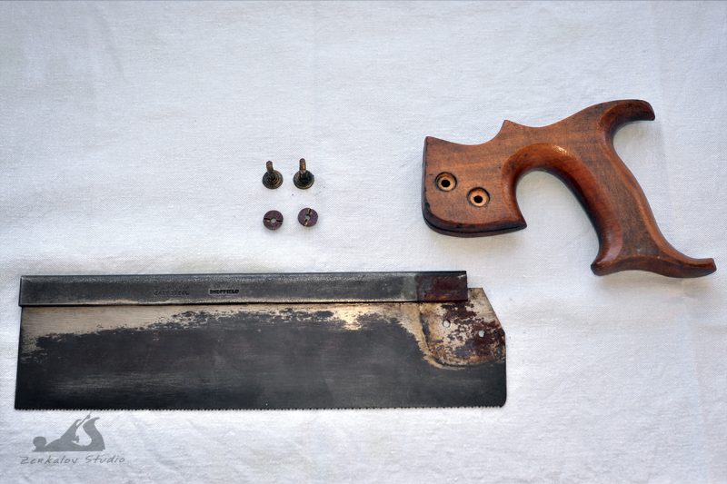 Писал не так давно о пришедших с eBay старых обушковых пилах, которые нужно было восстановить и поставить в строй. Дошла теперь и до них очередь. Поскольку пила на 14″ была в отличном состоянии, то там ничего не стал делать кроме полировки латунных частей и очистки рукояти от грязи, а вот 2 пилы на 10″ требовали значительной реставрации. Покажу как проходил процесс на примере одной из них. Первым делом разобрал и осмотрел, что да как. Ручка заметно люфтила и имела сильно неприглядный вид. Полотно хоть и было ровным, но ржавчина превратилась в воронение и лежала толстым слоем.