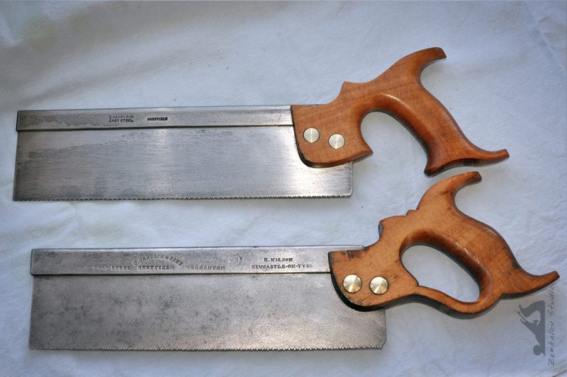 Первым делом привёл в порядок рукоять. Рубанком восстановил плоскость, сняв немного материала. Рукоять из бука. Можно было бы и шлифмашиной это сделать, но тут цель была вернуть не только плоскость, а в первую очередь грани смой рукояти, которые были съедены временем. Как не облагораживай деревянное изделие, а если нет четких граней, то новым оно не станет. Люфт на одной пиле вылечил подкладыванием шпона, а на второй просто подтянул винты.