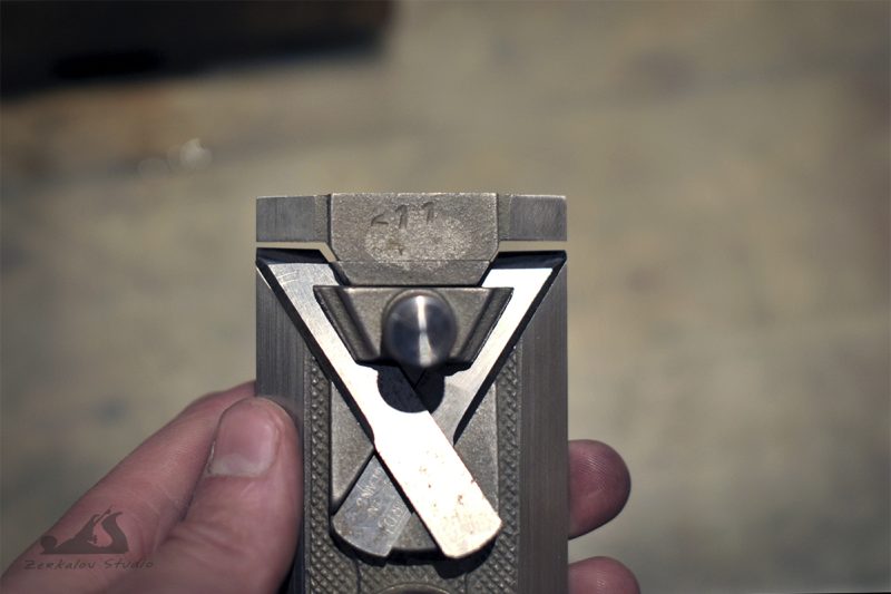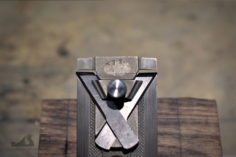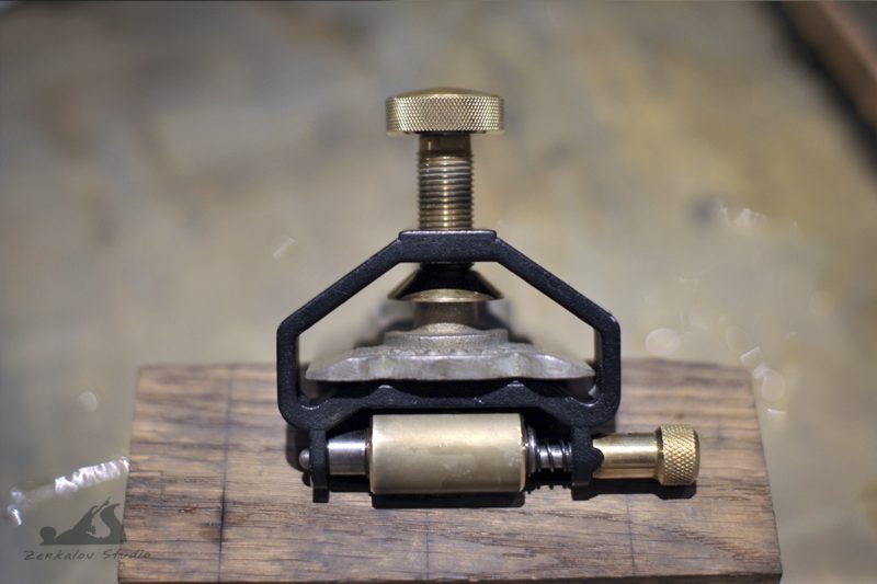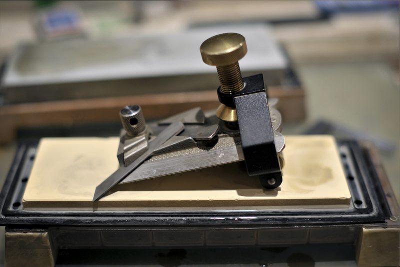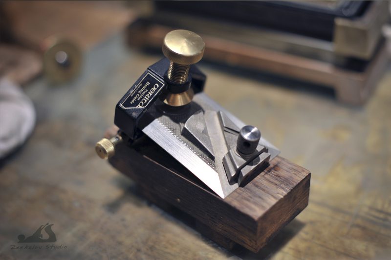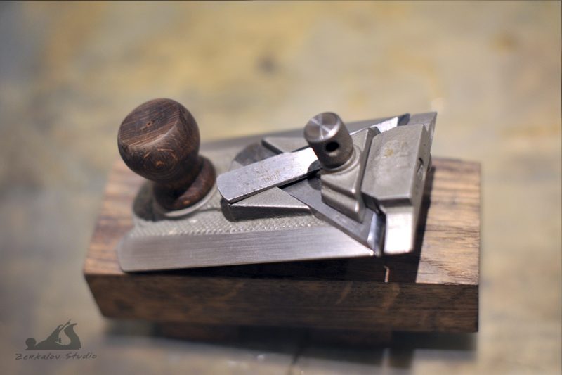 Современные подобные этому рубанки есть у Veritas и Lie-Nielsen. В таких рубанках нож в колодке расположен под двойным углом и при его заточке самым сложным является точно поймать угол положения ножа в теле колодки. Любая неточность будет проявляться в неравномерном вылете края фаски в ротике рубанка. Поскольку затачиваю все режущие инструменты на водных камнях при помощи тележки от Veritas, в которой эти ножи можно расположить только на глаз, то задача долгое время была просто неподъемной и приходилось обходиться «недозаточкой» на шлифбумаге дабы не испортить камень. Решение нашел на одном столярном форуме у английских коллег, за что им большое спасибо!Способ скопирован и опробован частично с моими дополнениями. Его суть заключается в том, что колодка рубанка и является удерживающим устройством при заточке. Нужно только перевернуть ножи и поменять их местами. Вылет ножей делается по желанию и он отвечает за угол заточки. От себя могу добавить, что затачивать сразу два ножа не удобно (мне так показалось), поскольку выдвинуть сразу 2 лезвия одинаково не так просто, тк прижим у них общий.
