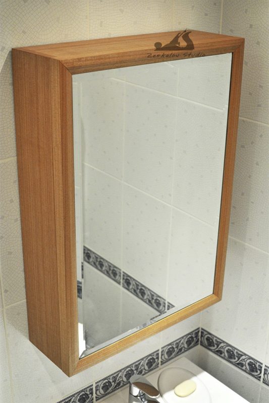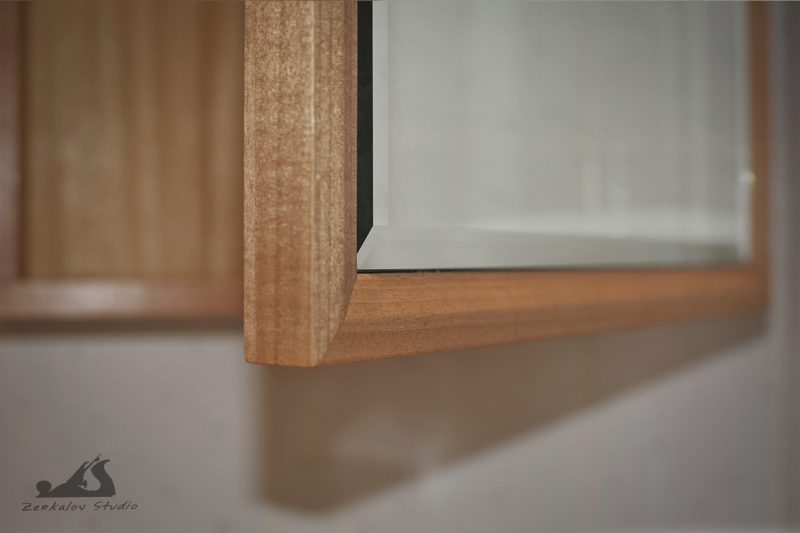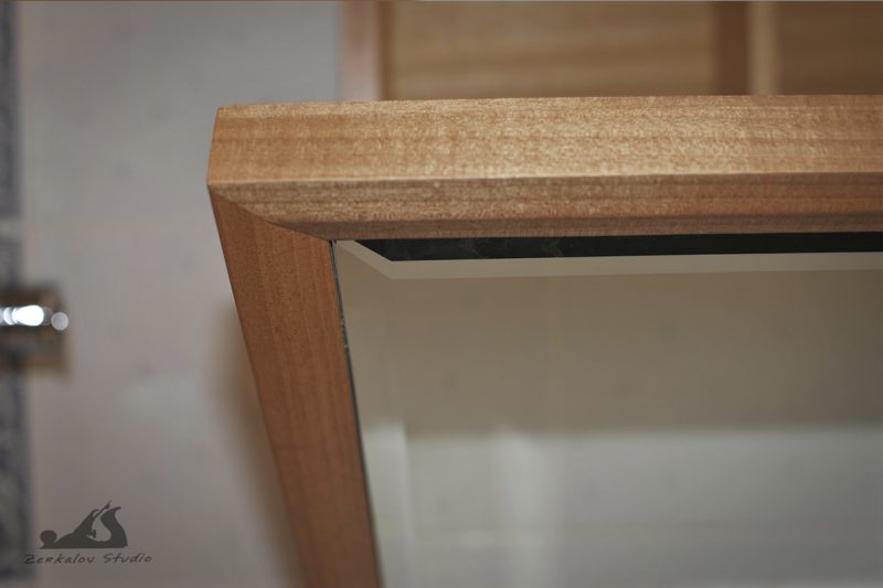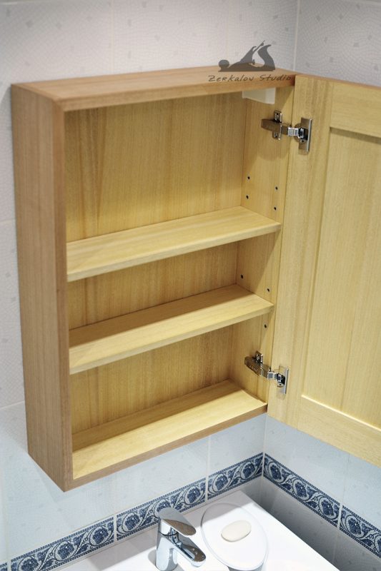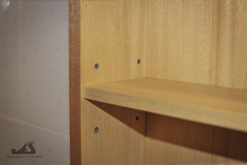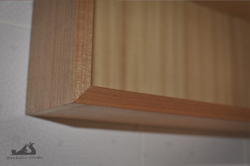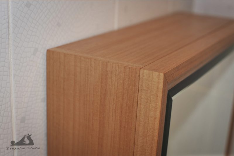 Корпус шкафа изготовлен из сосны, задняя стенка и изнанка фасада из фанеры. Все детали облицованы натуральным шпоном 0,6 мм. Шпон абачи использовался для фанеровки внутри, аниегри для лицевой облицовки. Зеркало 6 мм с фацетом шириной 15 мм. В качестве финишного покрытия попробовал масло Osmo с твердым воском.