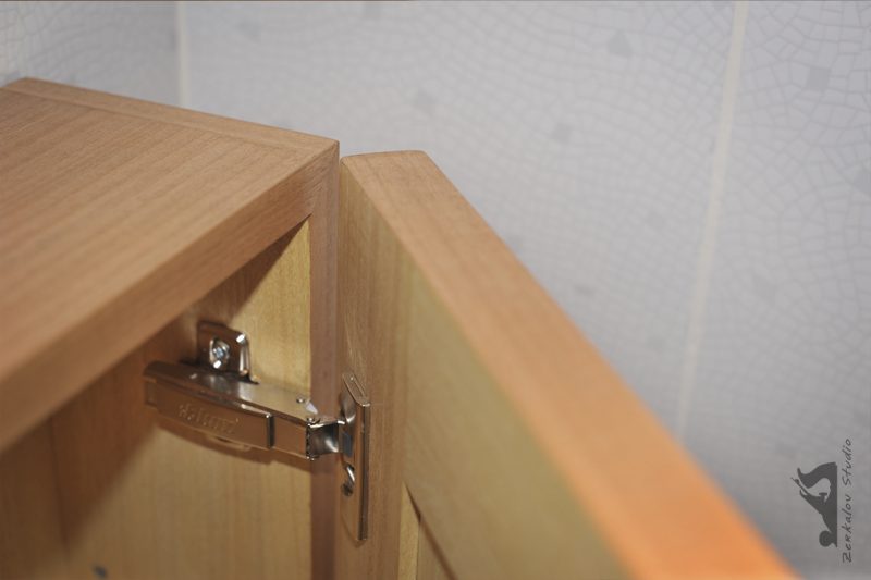 Результат мне понравился. Масло дало действительно мягкое шелковисто-матовое покрытие. Сохнет при нанесении не быстро и есть достаточно времени для растирки излишек по поверхности. Например масло Rustins тиковое сохнет при нанесении гораздо быстрее начинает липнуть если возникла необходимость вернуться на ранее покрытый маслом участок. Цена у Osmo не демократичная — это, пожалуй, единственный отмеченный мною минус. Фурнитура петли Blum с доводчиком. Приятно, что Blum делает ко всем своим петлям заглушки и накладки с целью скрыть крепежные элементы.