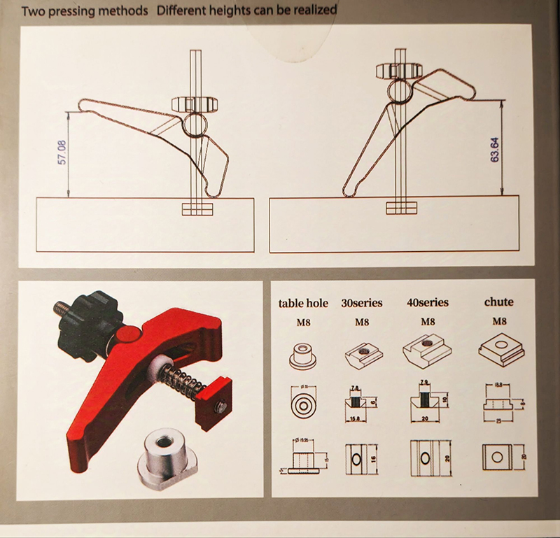 В комплекте с прижимом идёт богатый набор ползунков для различных типов Т-треков. Можно даже устанавливать их в круглые отверстия верстака диаметром 20 мм. Гайки-ползунки для Т-трека сразу посадил на фиксатор резьбы.