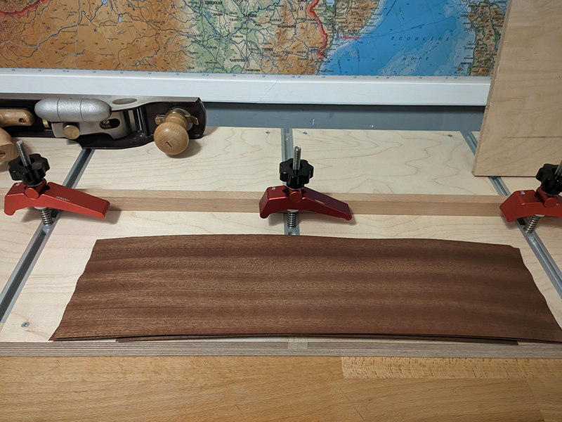 Я много работаю со шпоном и задача по пристрагиванию пачки шпона для будущей рубашки решается теперь быстро при помощи такого приспособления. Укладываю шпон с небольшим свесом и прижимаю через фанеру сверху. Рубанком снимаю ровно по краю фанерного основания. Оно должно быть ровным разумеется. После этого шпон легко собирается в рубашку с идеальным прилеганием листов друг к другу.