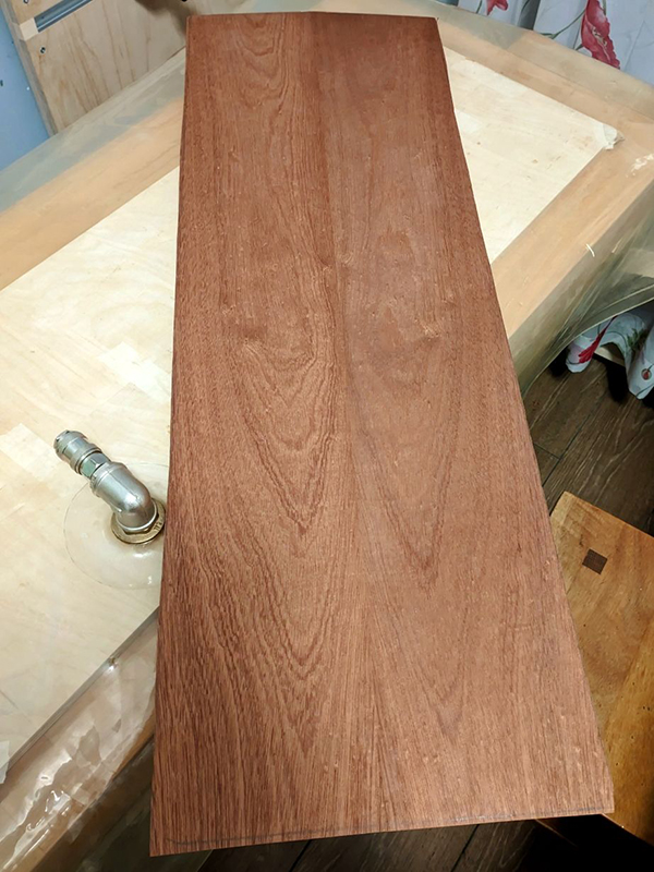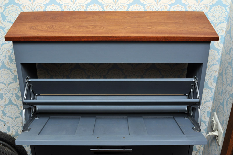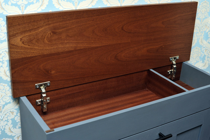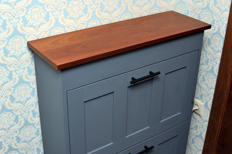 Верхняя крышка отделана шпоном сапели. Покрывал шпон маслом Borma. Крышка на шарнирных петлях с доводчиками, которые выполняют роль плавного торможения при закрывании. Под крышкой небольшое пространство для хранения перчаток и других мелочей. Есть небольшое отделение для средств по уходу за обувью или перчаток. Специально не делал выдвижной ящик чтобы не превращать обувницу в комод и самое главное на крышке никогда не приживутся вазочки и прочая мелочь для сбора пыли.